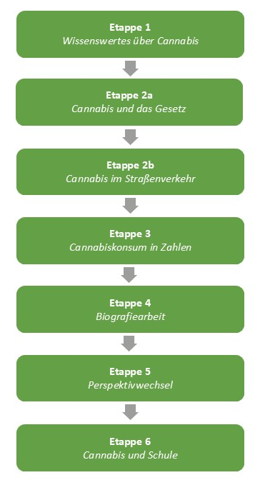 „Cannabis – quo vadis?“ ist ein interaktiver Workshop, welcher den Teilnehmenden anhand von sechs Etappen fachlich fundierte und sachliche Informationen zum Thema Cannabis vermittelt. Bestehende Mythen wie z. B. „Kiffen ist gesünder als Rauchen“ und andere Fehlinformationen werden korrigiert. Zudem werden die Teilnehmenden des Workshops unter anderem über mögliche Auswirkungen auf den Straßenverkehr aufgeklärt. Während des Workshops setzen sich die Jugendlichen auch mit ihrer eigenen Biografie auseinander, indem sie mögliche Auswirkungen des Cannabiskonsums mit Lebensentwürfen fiktiver Personen in Zusammenhang stellen. Auch Situationen zu Hause und in der Schule werden durchgespielt und diskutiert. Zusätzlich wird ein Perspektivenwechsel mit Eltern/Bezugspersonen sowie Lehrkräften angeregt. Abschließend erhalten die Teilnehmenden Informationen über das Hilfesystem in deren Region.